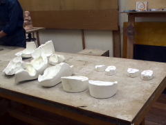 | 「おとぎの森」の作品は複雑な形をしているので、型こめという技法で、5個の部分に分けた石膏の型を使います。 |