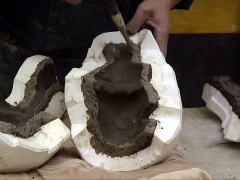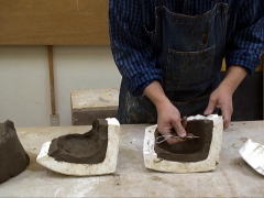 | よく乾燥した石膏型に、しっかりと粘土を込めてゆきます。表面にしわが寄ったり、空気が混ざったりしないように気を付けて粘土を込めます。 |