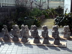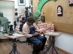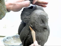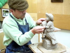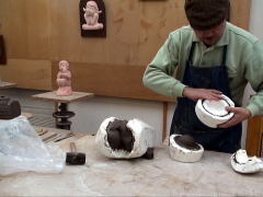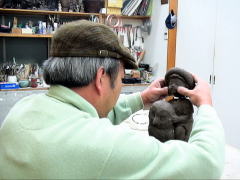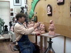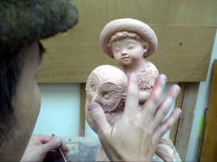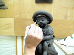 | 粘土の乾燥に応じて、顔などの細かな表情や形などを作っていきます。ですから、同じ型からとった作品でも一つ一つみな違ってきます。 |