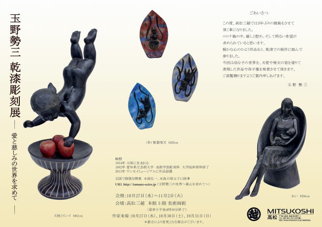 この度、高松三越では五年ぶりの個展をさせて頂く事になりました。 コロナ禍の中、癒しと慰め、そして明るい希望が求められていると思います。 あたたかな心のかよう作品をと、乾漆での制作に励んで参りました。